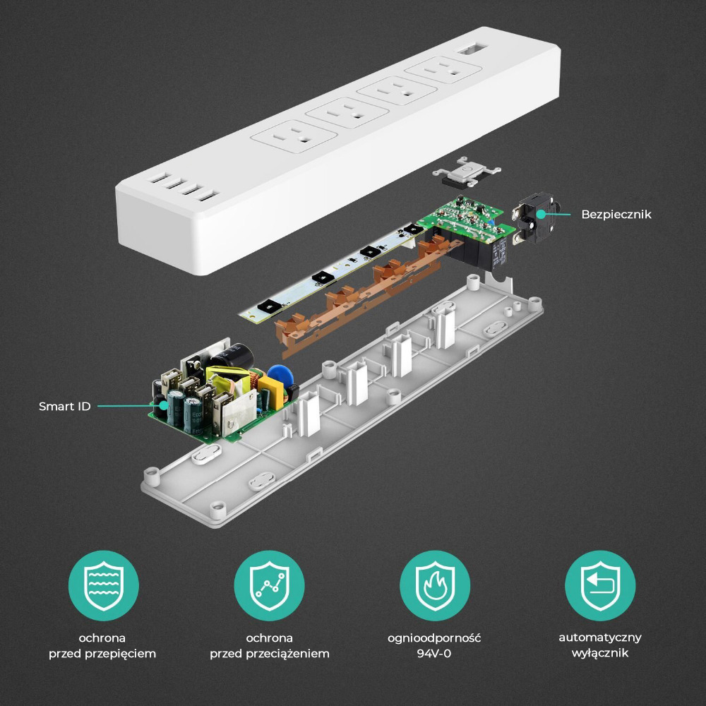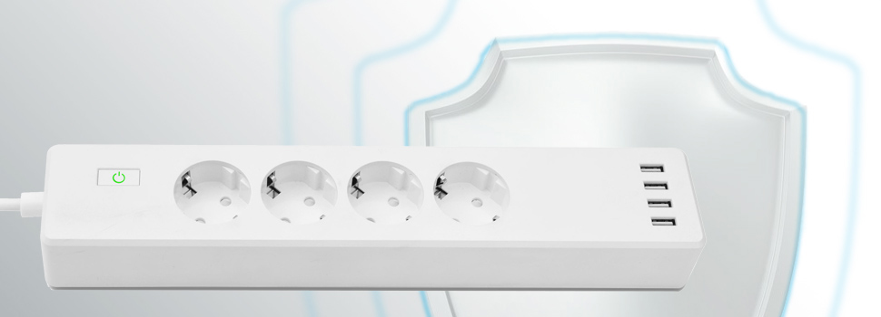 Przedłużacz Meross posiada aż cztery inteligentne gniazdka i cztery inteligentne porty USB, które zapewniają moc do 10 A. Szereg zabezpieczeń przeciwko przepięciom i przetężeniom prądu oraz przeciążeniom elektrycznym sprawia, że nie musisz się martwić o swój sprzęt.