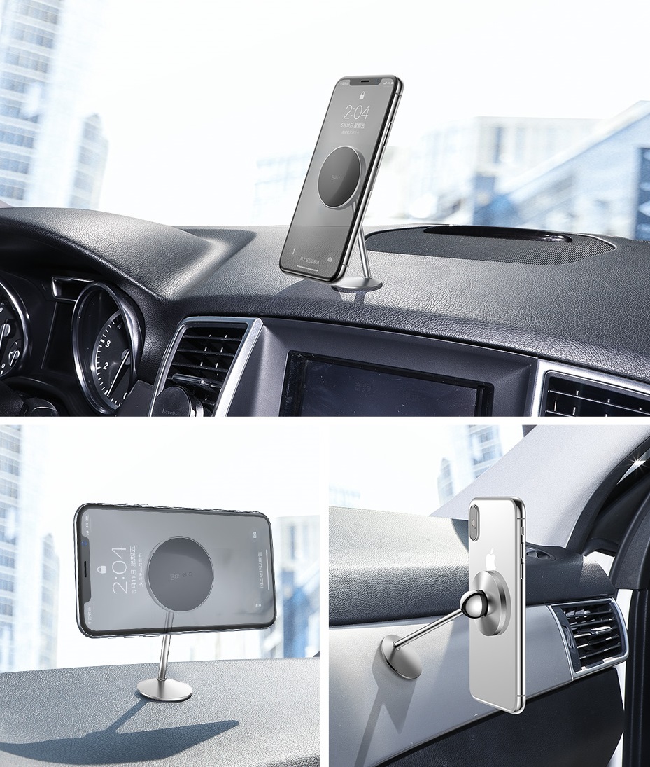 Montowany jest na deskę rozdzielczą za pomocą dwustronnej taśmy klejącej. Dzięki blaszce montowanej w obudowie i magnesowi, można sprawnie przymocować telefon do uchwytu. Kulka wbudowana w uchwyt pozwala na regulację położenia telefonu. Urządzenie został wyposażone w 4 silne magnesy, które są gwarancją stabilności i bezpieczeństwa telefonu. Z uchwytu bez trudu można korzystać za pomocą jednej ręki. W zestawie znajdują się 2 blaszki montowane do telefonu. Uchwyt jest bezpieczny dla telefonu i nie wpływa na niego negatywnie. Dzięki długiemu ramieniu telefon może być mocowany pionowo i wygodnie obsługiwany w zakresie 360 stopni, podczas gdy małe uchwyty tylko w zakresie 240 stopni.