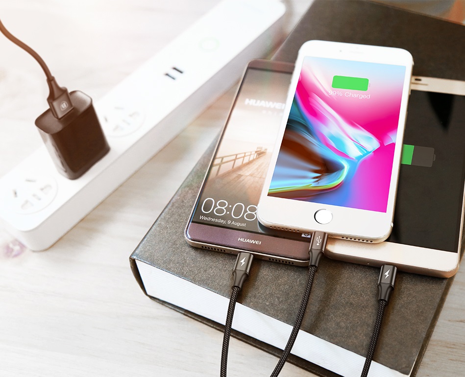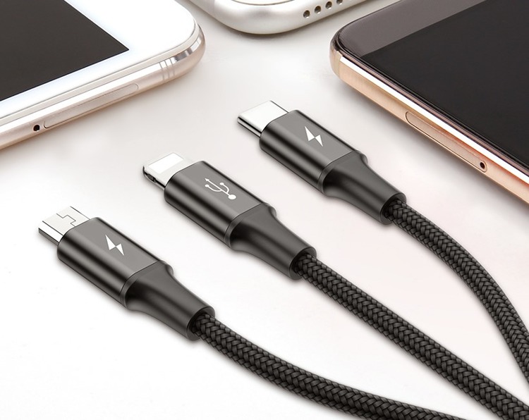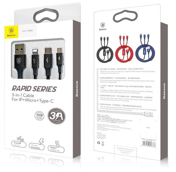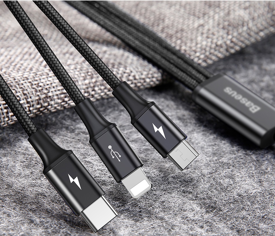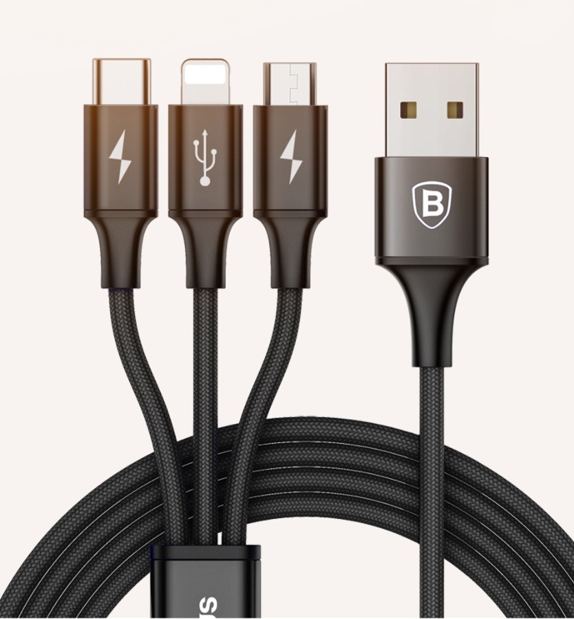 3w1: microUSB + Typ-C + Lightning firmy Baseus. wykonany z wysokiej jakości materiałów (aluminium, nylon, PVC). Dzięki trzem końcówkom możemy ładować urządzenia z gniazdem: Lightning (Apple), microUSB i USB Typ-C. Powłoka nylonowa z której wykonany jest przewód gwarantuje dużą wytrzymałość i zapobiega plątaniu się. Kabel zapewnia szybki transfer danych (tylko przez złącze lightning) i ładowanie do 3A (nawet trzy urządzenia jednocześnie).
