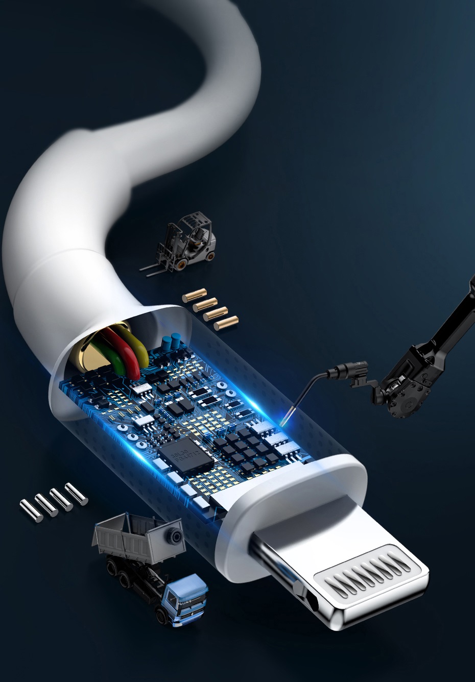 Kabel został wykonany z najwyższej jakości materiałów, stosowanych w fabryce marki Apple. Przewód Baseus nie koroduje i nie utlenia się, dzięki czemu cały czas wygląda, jak zupełnie nowy. Dodatkowo użycie oryginalnego chipu oraz ulepszonej wtyczki C94 pokrytej rodem i rutenem, zwiększa wytrzymałość wtyczki oraz bezpieczeństwo podłączonego urządzenia, a także zmniejsza straty energii.