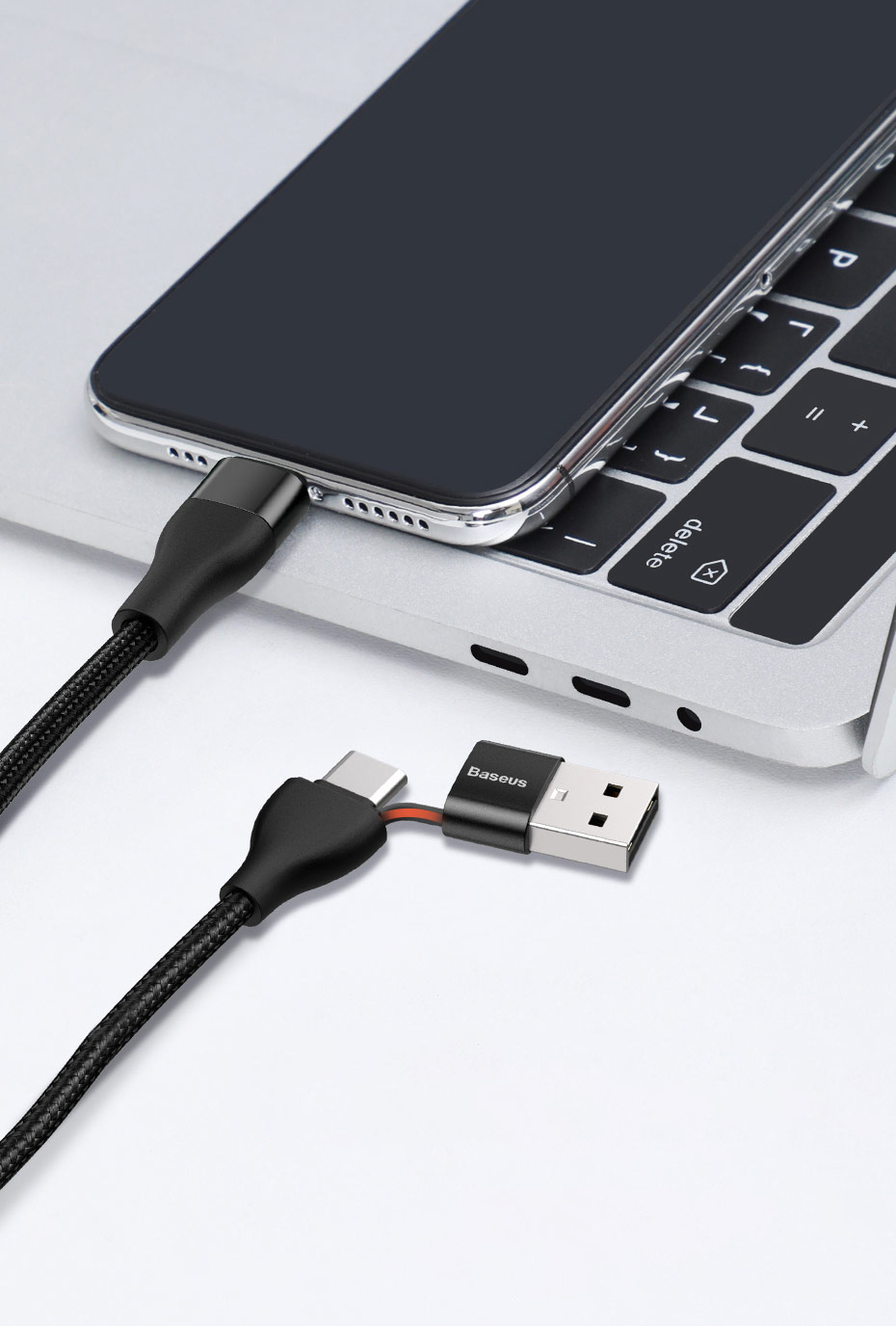 Przewód Baseus z podwójną końcówką umożliwia ładowanie oraz szybką transmisję danych. Dzięki możliwości wyboru pomiędzy USB-C a USB masz większe możliwości podłączenia do ładowarki lub komputera.