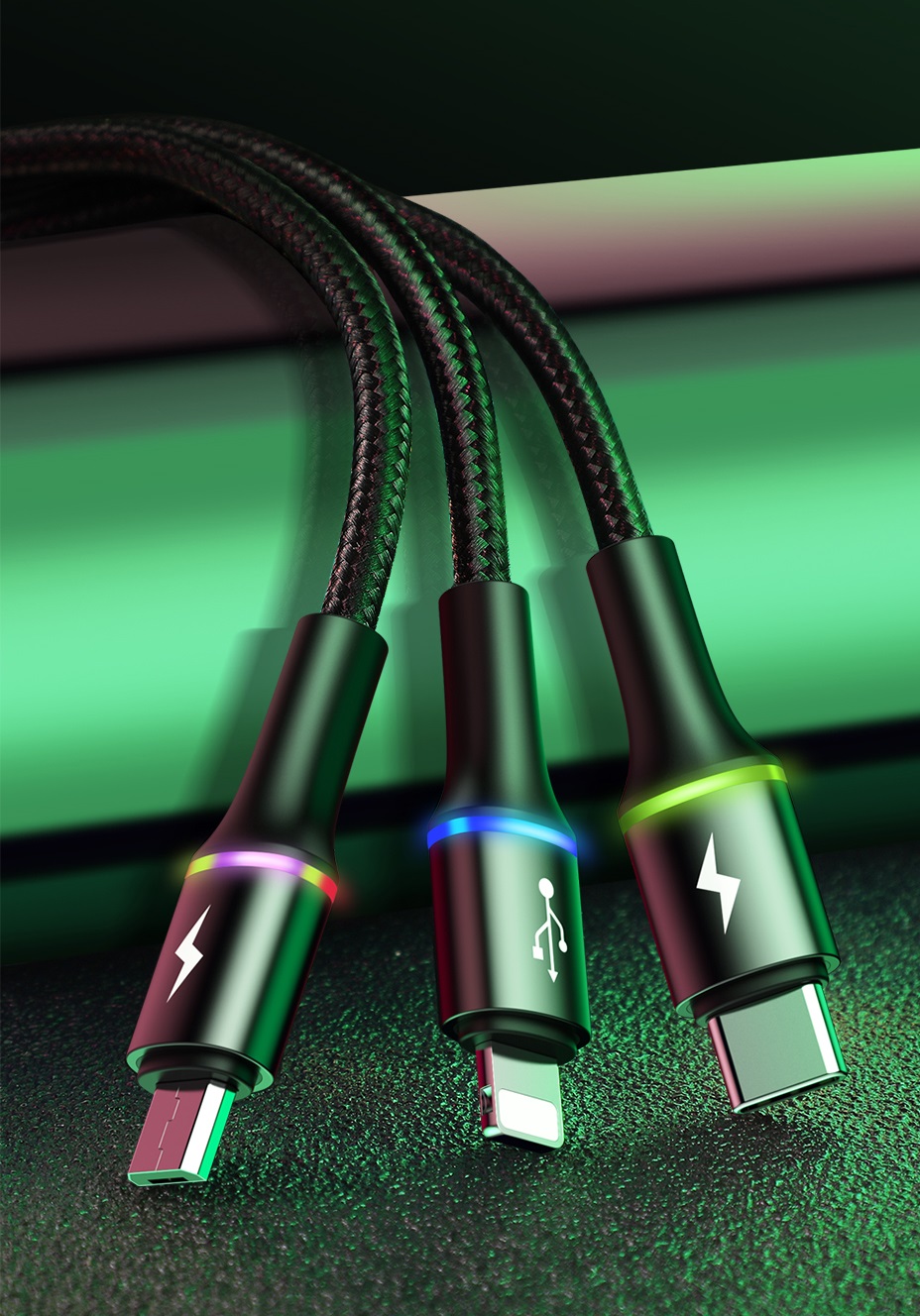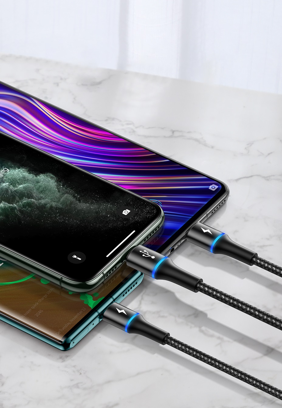 Przewód marki Baseus pozwala na jednoczesne ładowanie aż trzech różnych urządzeń. Posiada końcówki Lightning, USB-C oraz Micro USB. Ładuje trzy urządzenia jednocześnie, bez obaw o wolniejsze ładowanie któregoś z urządzeń.