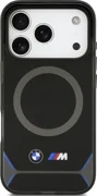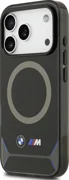 The back part includes an integrated MagSafe ring, while the lower part is decorated with subtle blue decorative lines and the BMW M logo, emphasizing its sporty character and precision craftsmanship.