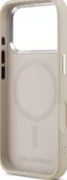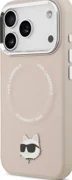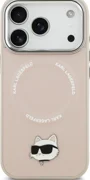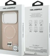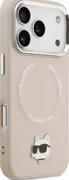 The back is adorned with a characteristic Choupette metal pin, giving the accessory a unique, fashion-forward character. The overall design is complemented by an aluminum camera frame and silver-colored side buttons, emphasizing the luxurious nature of the product. The MagSafe ring features the “KARL LAGERFELD” inscription, adding elegance and unique style.