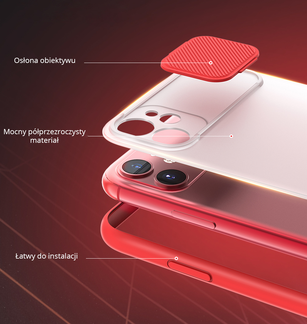 Etui składa się z przesuwnej osłony obiektywu, bardzo wytrzymałego półprzezroczystego tyłu oraz miękkich boków, które pozwalają na łatwe założenie i ściągnięcie pokrowca na telefon bez ryzyka porysowania obudowy smartphona.