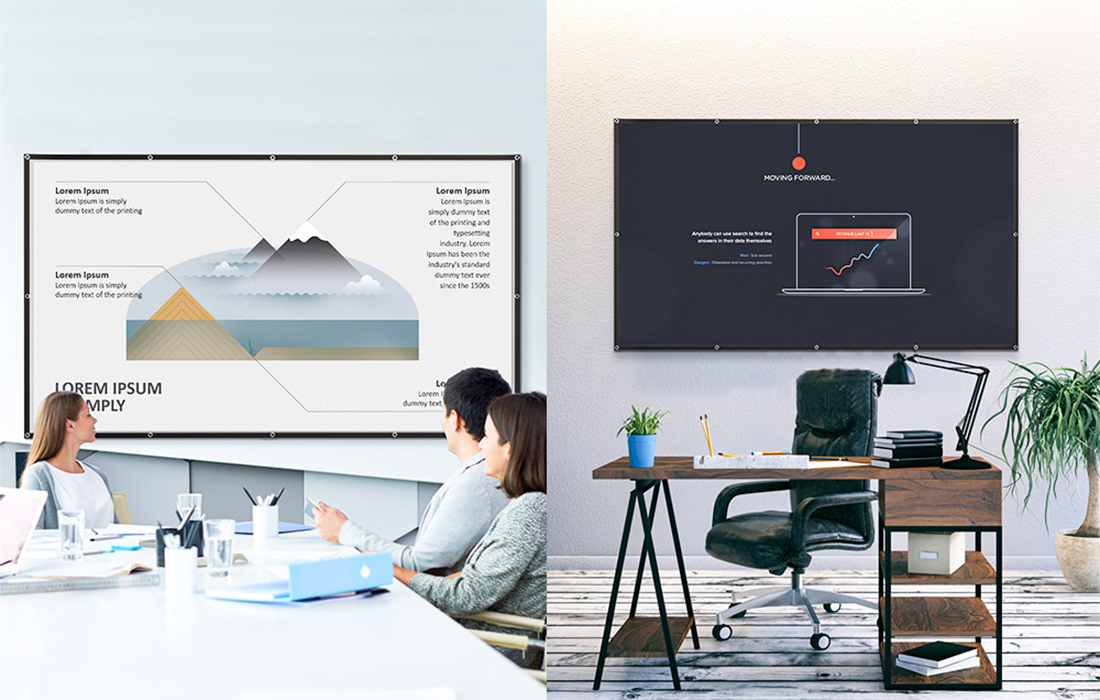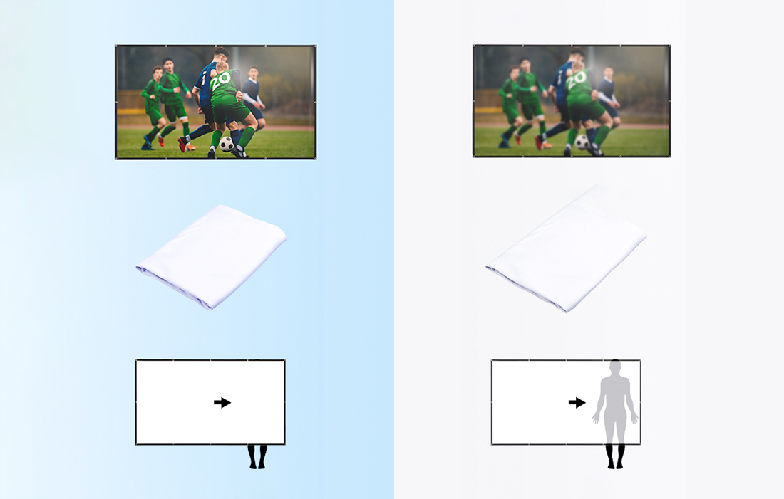 Wysokiej jakości materiał PVC jest łatwy w przechowywaniu. Możesz go bez obaw zwijać, prać i prasować. Co więcej, w porównaniu do innych ekranów, ten model zapewnia wyświetlanie filmów w jakości HD. Dodatkowo, materiał jest grubszy, dzięki czemu nie prześwituje. Ponadto, materiał nie marszczy się i znakomicie wyświetla obraz pod kątem aż do 160°.