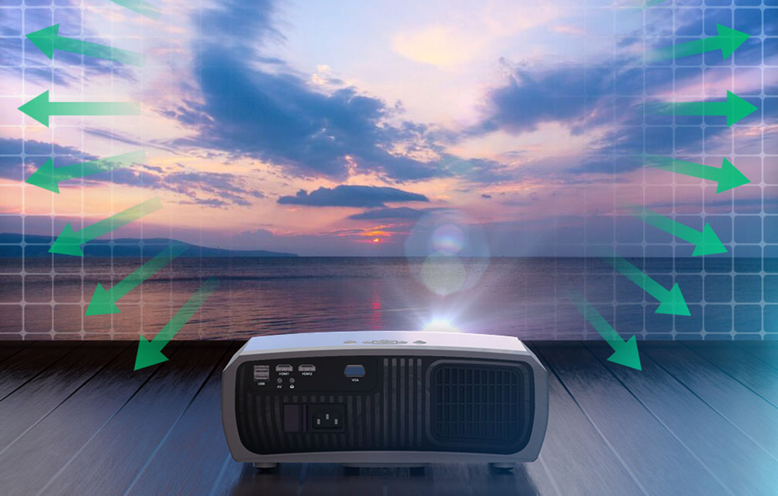 Urządzenie wyświetla kwadratowy obraz po zamontowaniu go w dowolnej pozycji. W szybki i prosty sposób możesz ręcznie ustawić ostrość obrazu w jakości HD. Ponadto, dzięki wysokiej rozdzielczości 1920 x 1080 P poczujesz się jak w sali kinowej. Dodatkowo, projektor posiada 2 wiatraki o wymiarach 9025 x 9330, dzięki którym urządzenie jest regularnie schładzane, co wydłuża jego żywotność. Co więcej, wiatraki pracują bardzo cicho więc nie będą przeszkadzać podczas seansów filmowych.