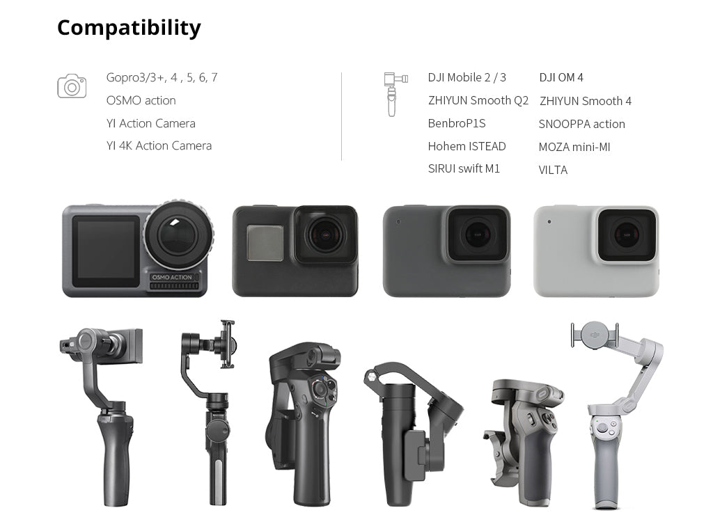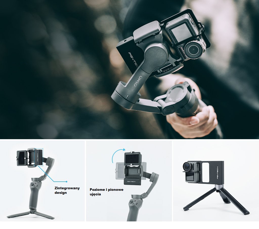 Adapter mocowania kamer sportowych pozwoli Ci korzystać z funkcji Osmo Mobile 3 oraz DJI OM 4 nie tylko poprzez smartfon, ale także za pomocą Twojej kamery sportowej jak DJI Osmo Action czy GoPro. Korzystaj z funkcji stabilizatora i nagrywaj niezwykłe ujęcia swoją kamerą. Montaż adaptera, jak i kamery jest niezwykle łatwy i szybki. Konstrukcja adaptera została starannie przemyślana, więc nie nie musisz się martwić o jakiekolwiek uszkodzenie kamery. Dodatkową zaletą jest kompatybilność z Osmo Mobile 2, ZHIYUN Smooth 4, ATOM, FEIYU VLOGpocket czy MOZA mini-SE.