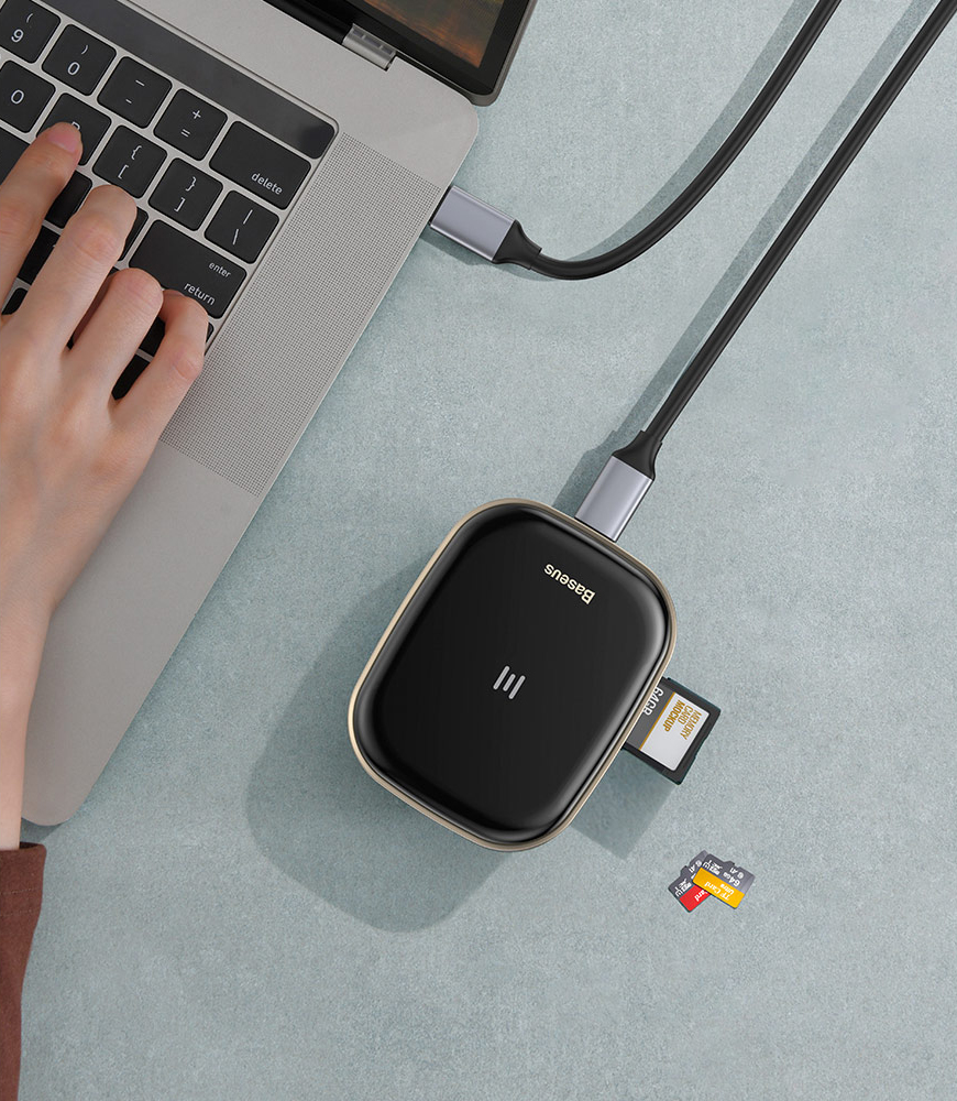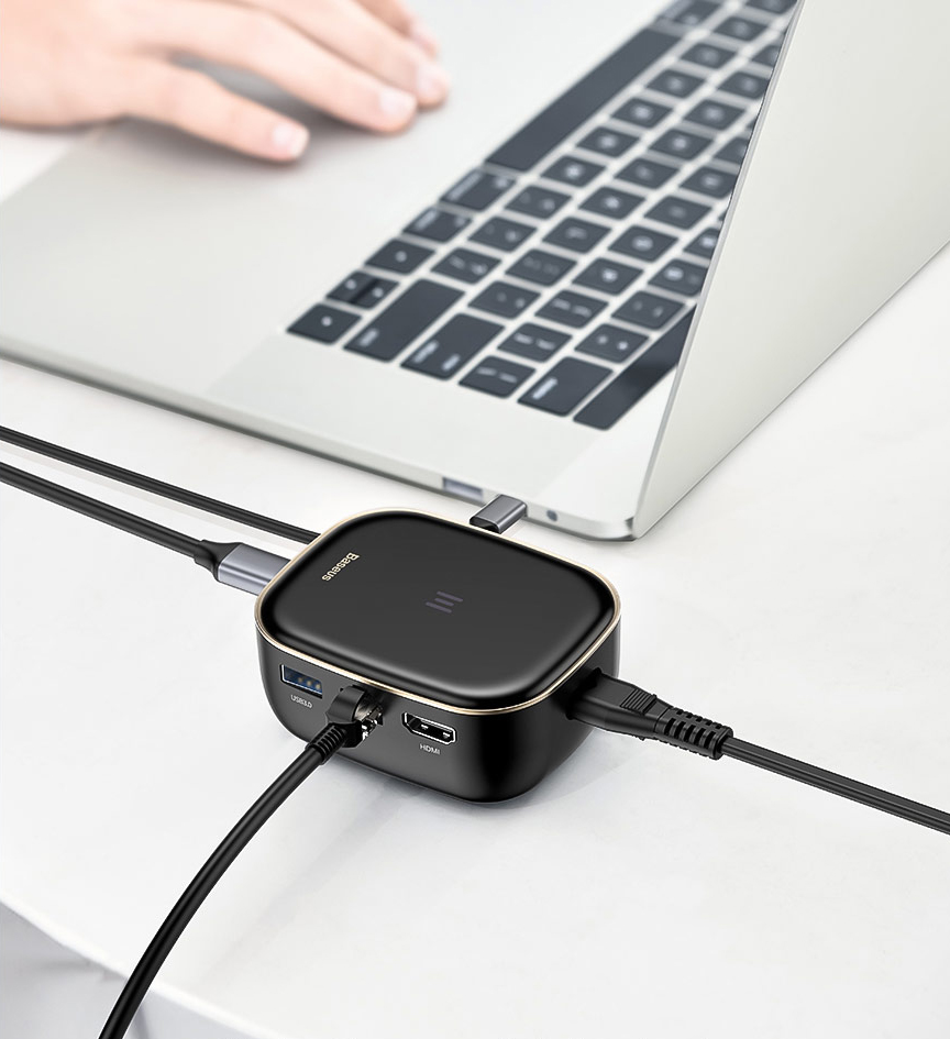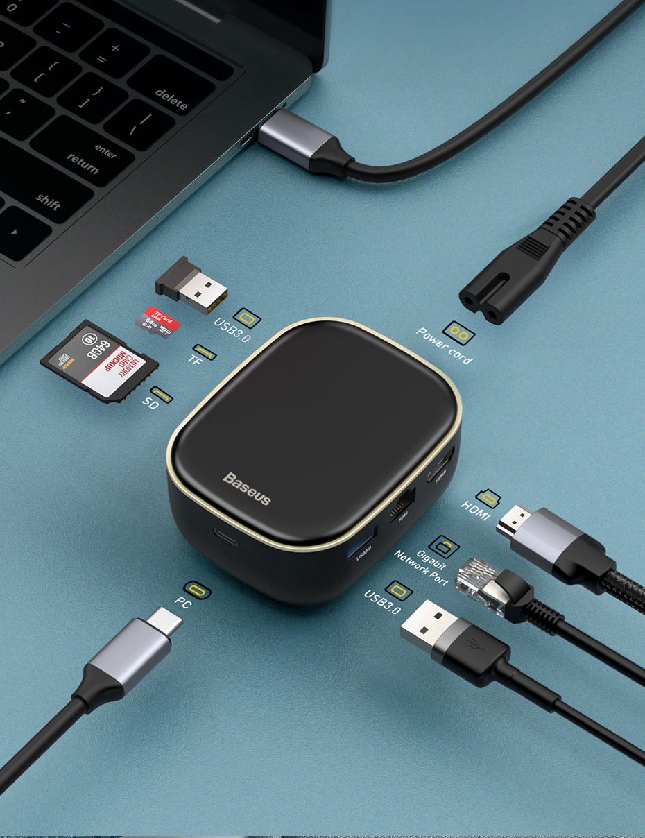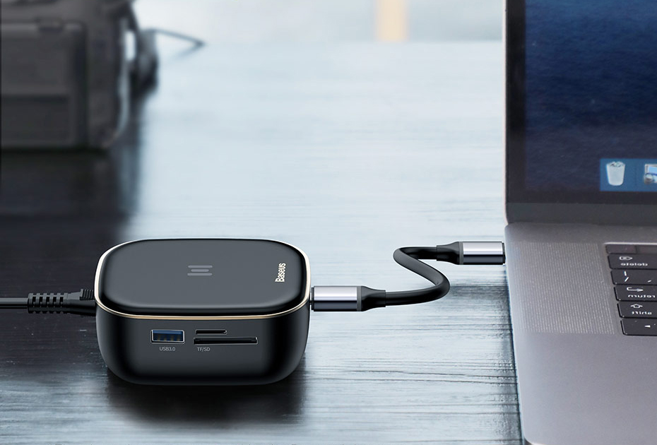 Uniwersalny hub firmy Baseus posiada wejście na dwie pamięci karty pamięci, 2 wejścia USB 3.0, wejście HDMI, wejście ethernet, wejście zasilania oraz USB-C - którym podłączymy urządzenie do komputera. Wszystko to, aby ułatwić korzystanie z komputera i dodać mu kilka nowych możliwości.