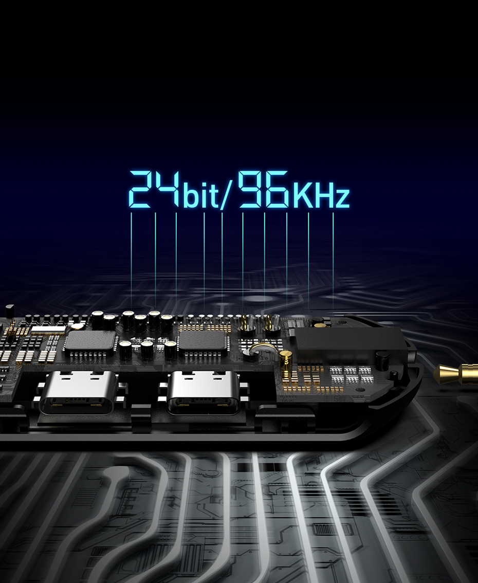 Częstotliwość dźwięku 24-bit/96 kHz w połączeniu ze dwukanałowym wzmacniaczem mocy DAC zapewnia oryginalną jakość dźwięku, dzięki czemu jest czysty i niezakłócony. Ciesz się brzmieniem swoich ulubionych utworów oraz nieograniczonymi rozmowami z najbliższymi.