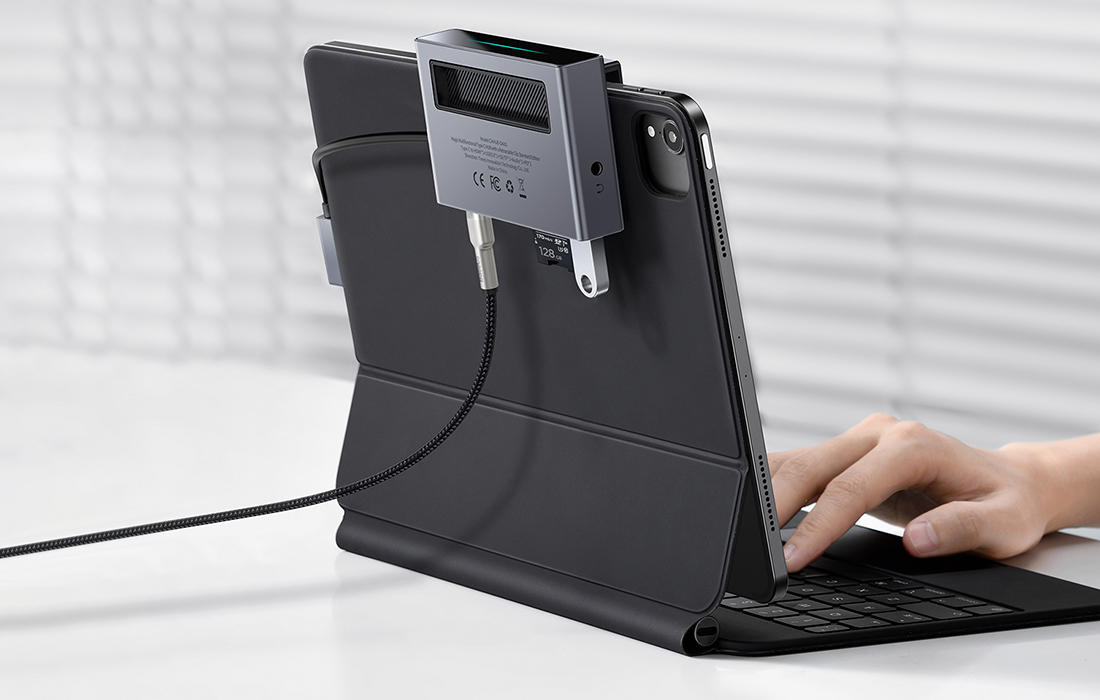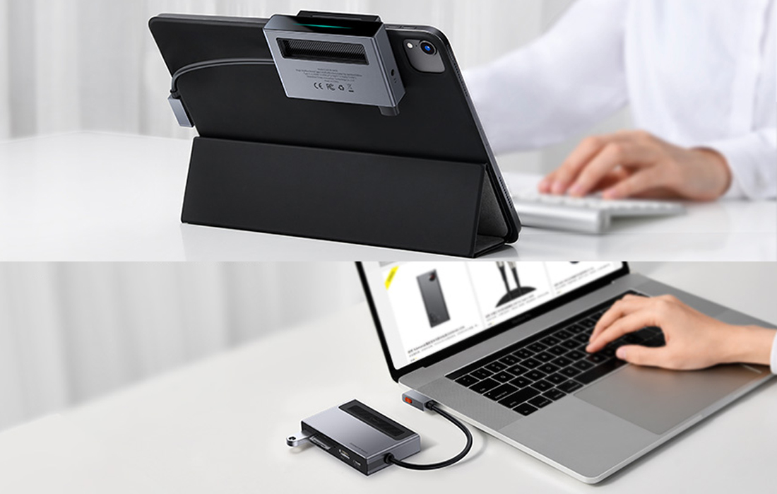 Masz mało miejsca na biurku? Żaden problem! Hub został wyposażony w praktyczny klips, za pomocą którego stabilnie przymocujesz go do tabletu. Jego szerokość możesz regulować w zakresie 0-10,5 mm, z powodzeniem dopasujesz go zatem do wielu różnych urządzeń. Uchwyt został zaprojektowany w taki sposób, aby po zamontowaniu nie zasłaniał wyświetlacza. Wszystko to pozwoli Ci zaoszczędzić przestrzeń na biurku i nadal wygodnie pracować!