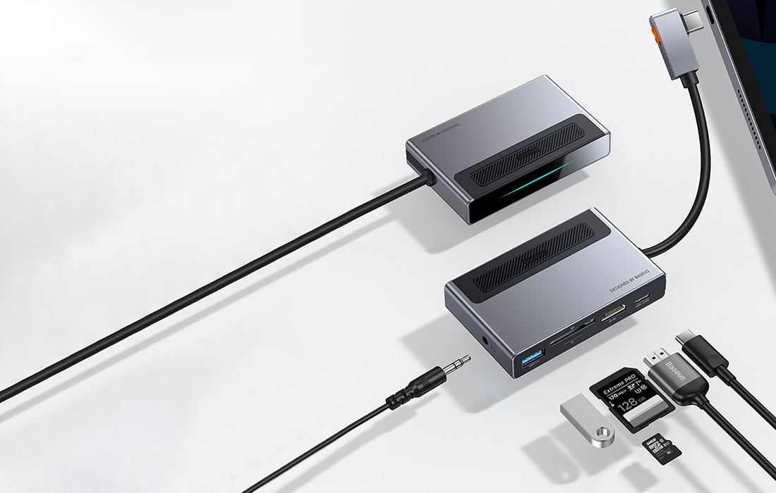 Problem braku wolnych portów w laptopie lub tablecie jest Ci znany? Hub 6w1 marki Baseus pozwoli Ci o nim zapomnieć! Kompatybilny z wieloma różnymi urządzeniami - znacznie zwiększy Twoje możliwości podczas pracy, nauki, a nawet zabawy. Został wyposażony w 6 portów - w tym między innymi USB 3.0, audio jack, USB-C i HDMI. Obsługuje szybkie ładowanie PD 100 W oraz wyświetlanie obrazu 4K. Za jego pomocą możesz używać 2 kart pamięci jednocześnie i przesyłać pliki z prędkością do 5 Gbps. Specjalny klips umożliwia wygodny montaż urządzenia na tablecie.