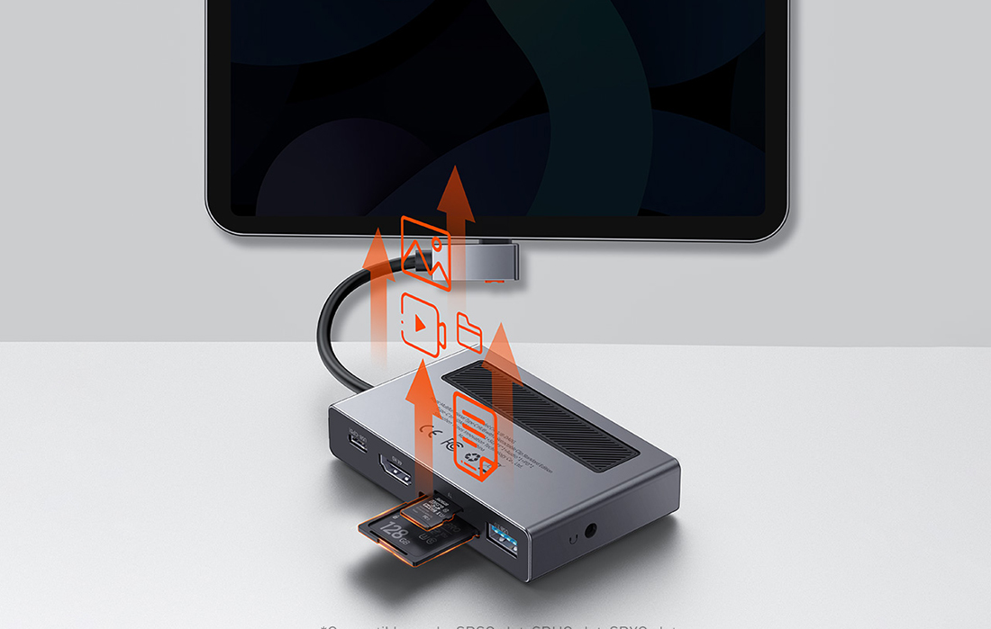 Hub został też wyposażony w 2 wejścia na karty pamięci - TF oraz SD. Maksymalna obsługiwana pojemność wynosi aż 2 TB. To wystarczająco dużo, aby zapewnić sobie prosty dostęp do wielu różnych plików. Po prostu włóż kartę do portu i wygodnie zarządzaj zapisanymi na niej danymi!