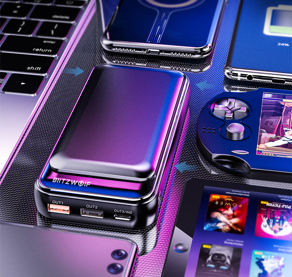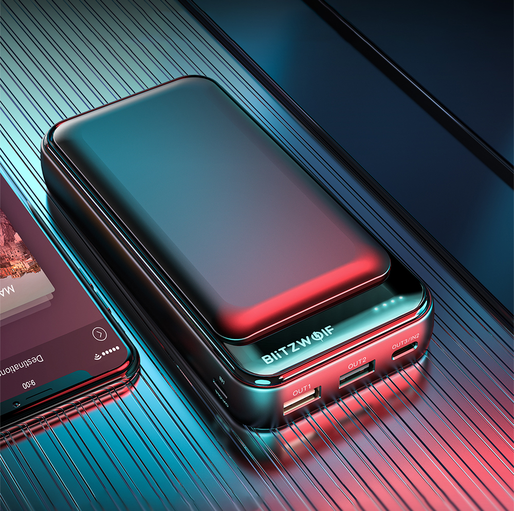Powerbank marki Blitzwolf o pojemności 20 000 mAh pozwala na równoczesne ładowanie trzech urządzeń. Wspiera technologię szybkiego ładowania PD, QC 3.0.